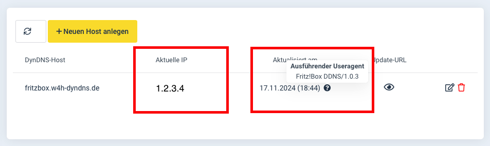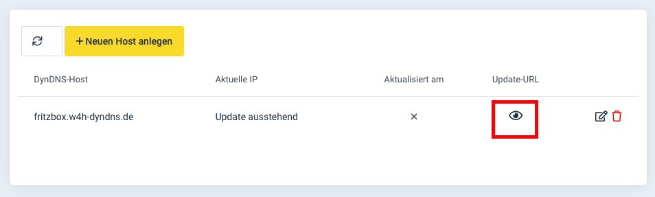 3.) Nachdem Sie den DynDNS-Host angelegt haben, klicken Sie auf das "Augen-Symbol" um die Update-URL anzuzeigen.
